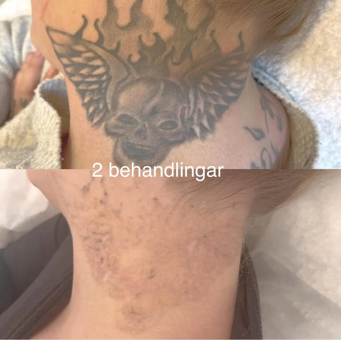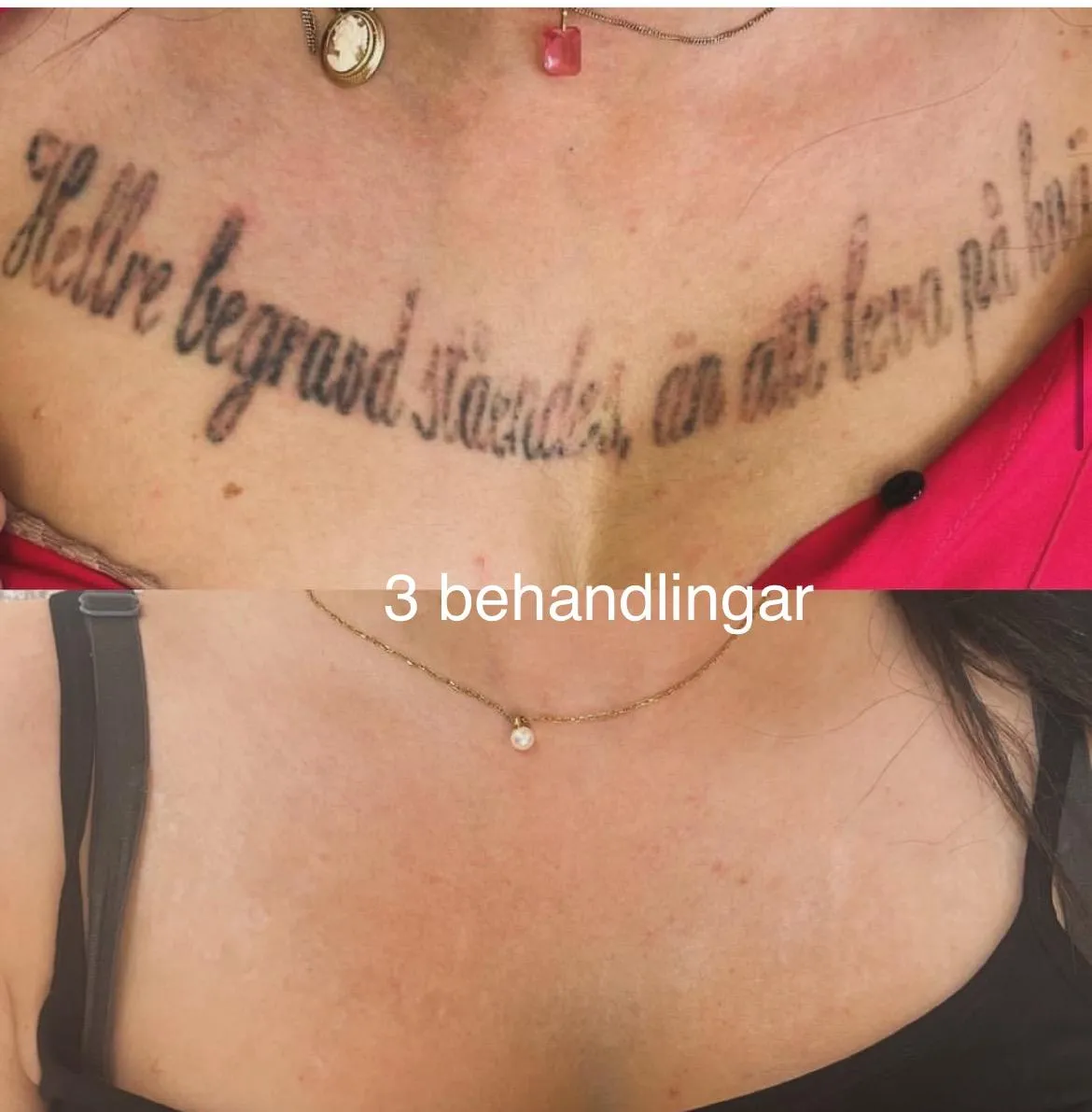 Borttagning av tatuering med laser kräver oftast flera behandlingssessioner. Antal behandlingar för att ta bort tatuering beror på mängd och typ av bläck som använts och djupet av bläcket i huden.